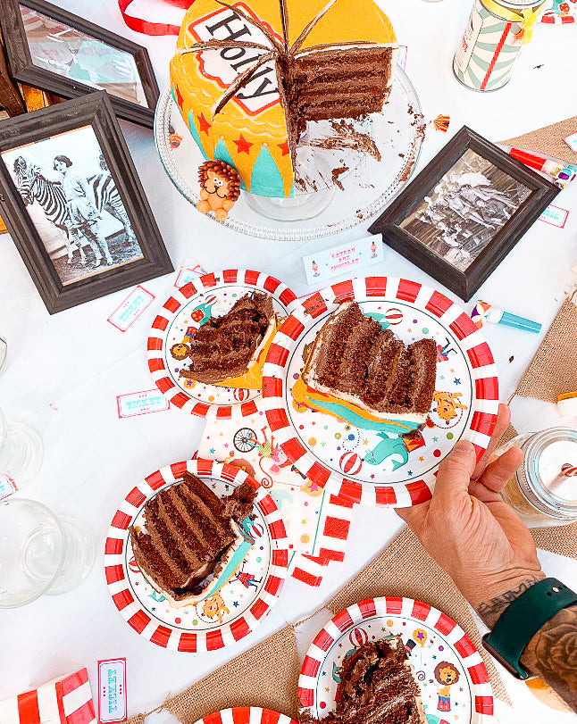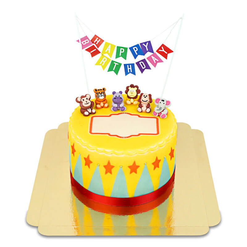 Spectacle gratuit avec notre nouveau grand Gâteau Cirque ! Le gâteau coloré à double hauteur est couronné d'un petit tigre en pâte d'amande et d'une belle guirlande de fanions colorés, ce qui fait de... Voir plus